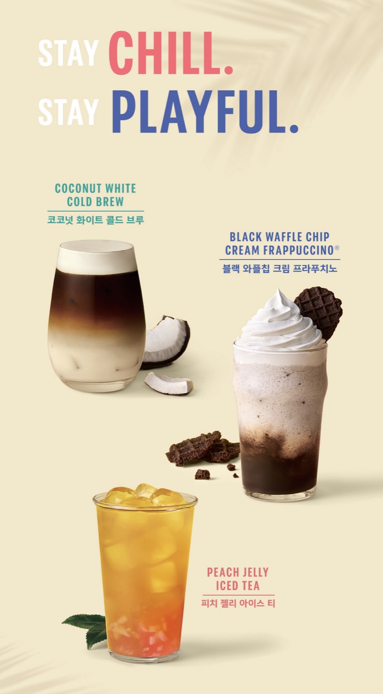 서머 1 프로모션 음료 종류로는 블랙 와플 칩 크림 프라푸치노, 피치 젤리 아이스티, 코코넛 화이트 콜드브루 이렇게 세 종류다.